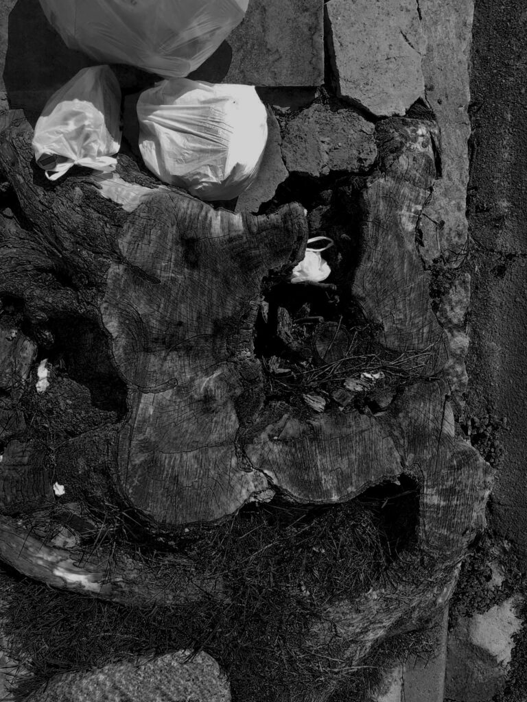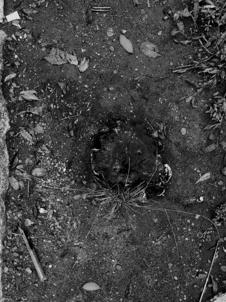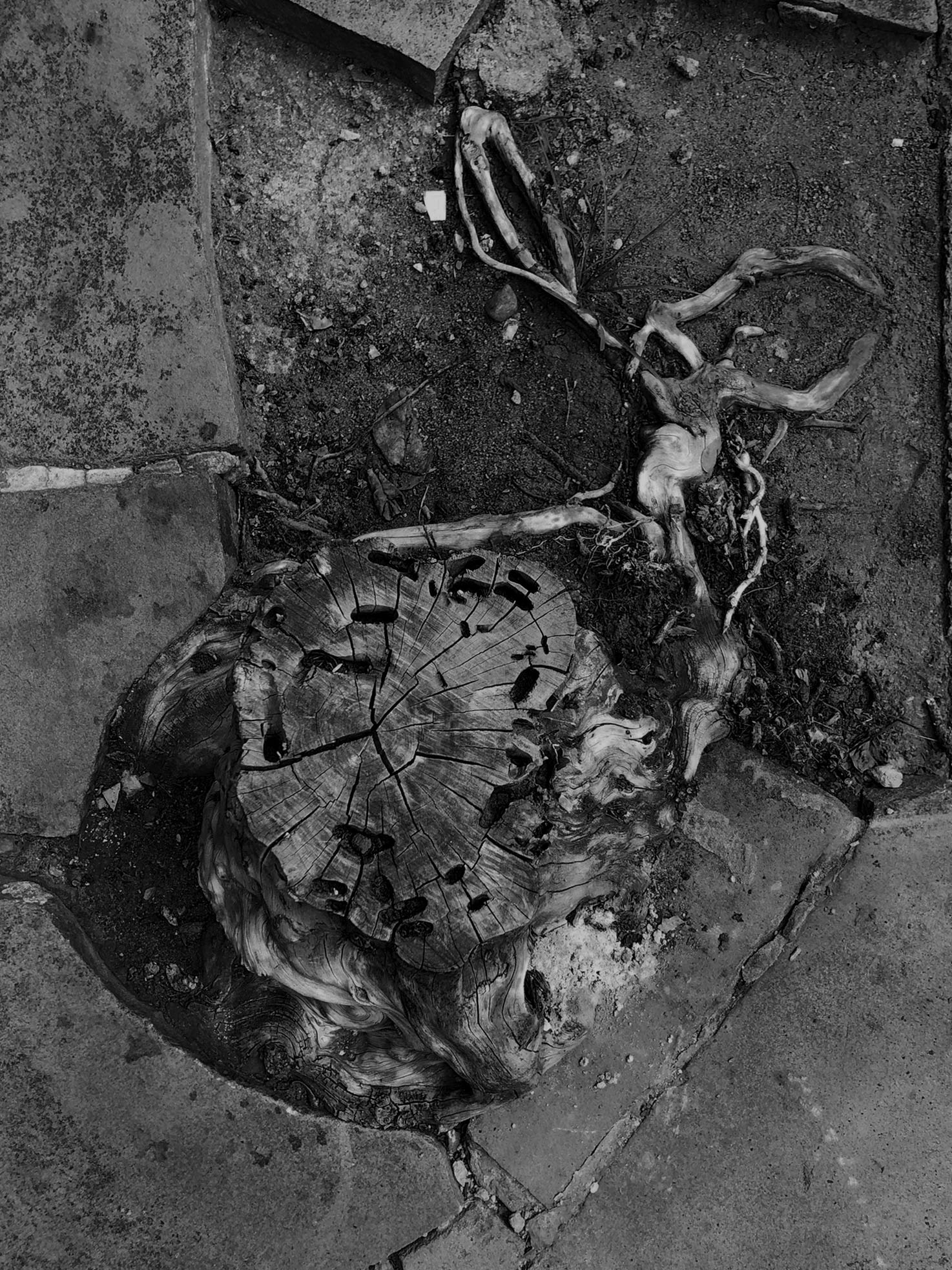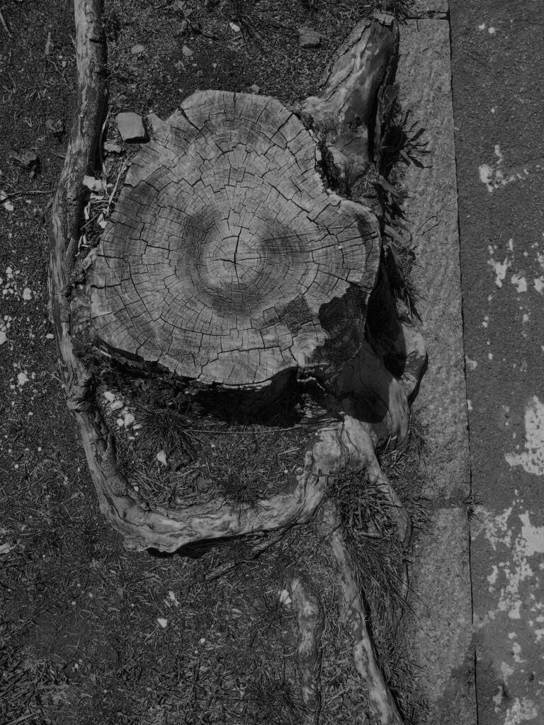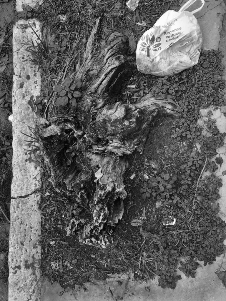 O corpo esbarra em uma lacuna de ar na calçada. No subterrâneo, a conexão colapsou. As palavras “corpo”, “ar”, “conexão” e “colapso” mexem com Cristine, ocupam seu trabalho. Ela as carrega em caminhadas diárias pelas ruas de seu bairro, em Porto Alegre. Há tempo, Cristine vem procurando entender o que conecta um corpo a outro. Perguntou-me, um dia: “Onde vai parar a porção de ar que um corpo desloca quando nasce?” – “esse mesmo ar” – ela aproxima a mão fechada de meu rosto e começa a abrir os dedos, um a um – “é empurrado por cada dedo que se ergue. Meu movimento pressiona o teu corpo. estamos todos conectados”. Cristine costuma dizer que “tropeçou” numa primeira árvore cortada junto à raiz quando caminhava em uma praça. Logo deparou-se com mais uma, mais outra e ainda outra. Encontravam-se em todos os tipos de passeio público e todas foram radicalmente extirpadas. A metáfora do tropeço traduz o desconcerto de Cristine diante dessas árvores evacuadas violentamente do ar que nos conecta. “Nos bairros de classe média, cortam o pé e deixam o toco. Nos bairros abastados, removem inclusive as raízes, mas preservam os canteiros”. As imagens de catálogo r são fruto de um tropeço, de uma sucção indevida. Elas nos entregam o que a ordem natural não nos permitiria ver: Anéis internos dos troncos; emaranhados de raízes puxadas para a superfície; a sombra de um oco. Com que facilidade eliminamos a vida; com que indiferença convivemos com seus restos. Certos enfrentamentos só se tornam suportáveis quando mediados pela arte.