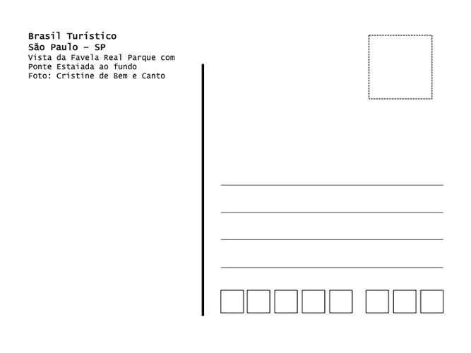 O trabalho postal apresenta uma vídeo-animação fotográfica e um cartão postal. O cartão mostra em primeiro plano, a favela do Real Parque, e, em segundo, a Ponte Estaiada, inaugurada em 2008, em São Paulo. As imagens da vídeo-animação foram tiradas por uma fotógrafa que atravessou o percurso proibido. e que ao cruzar a ponte, vivenciou um não caminho para o pedestre, no fim do outro lado, havia apenas a via para os carros.